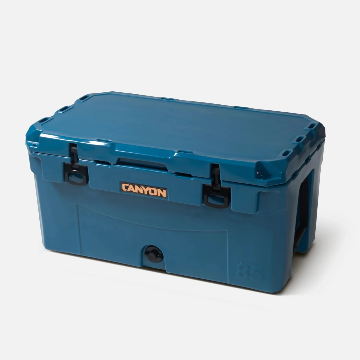 The Canyon Pro 85 Raft Cooler is the smaller brother to the ultra-popular Prospector 103, designed specifically to fit smaller rafts. Easily accessible front and side drain plugs make it simple to use the PRO 85 Raft Cooler on your raft or in truck beds. With top-notch insulation, this cooler can withstand long distances in the blazing desert sun. Thanks to front and rear lip slots, tying it into your pre-runner or raft frame is a breeze with a few 1′ cam straps. You can even open the cooler while its still securely attached to frame rails thanks to the internal tie-down slots. Plus, the zero clearance hinge allows for access in tight spaces.