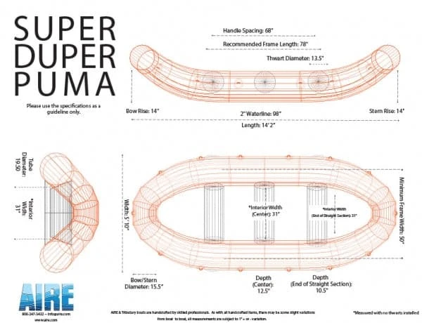 The AIRE Super Duper Puma 14′ Whitewater / Fishing Raft is the largest version of the the Puma Series. At 14’2″ x 5’10”, this raft has more interior room, higher load capacity and greater stability than the Puma or Super Puma. With three thwarts (sold separately), this boat accommodates up to a seven person paddle crew. The Super Duper also has plenty of room for up to three anglers when rigged for fishing. It’s a happy median between the sportiness of the Super Puma and the punching power and stability of the 143D. This is the perfect crossover boat for the fisherman that wants to do a few multi-day trips as well.
